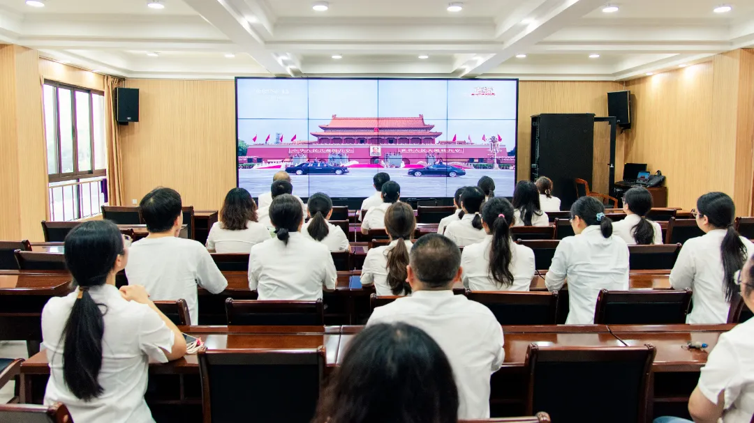 9时整,礼炮齐鸣,国歌雄壮,国旗招展。大会气象恢宏,激荡人心,全体干警认真聆听习近平总书记重要讲话,深刻感悟中国人民为拯救人类文明、保卫世界和平作出的重大贡献,深入领会革命先烈坚不可摧的民族精神、舍生取义的家国情怀。阅兵仪式上,徒步方队军容严整、步伐铿锵,国之重器锋芒尽显、气势如虹。新时代人民军队的强大实力和威武雄姿,充分展现了中国捍卫国家主权、维护世界和平的坚定决心。全体干警心潮澎湃,为祖国日新月异的强大实力深感光荣自豪。